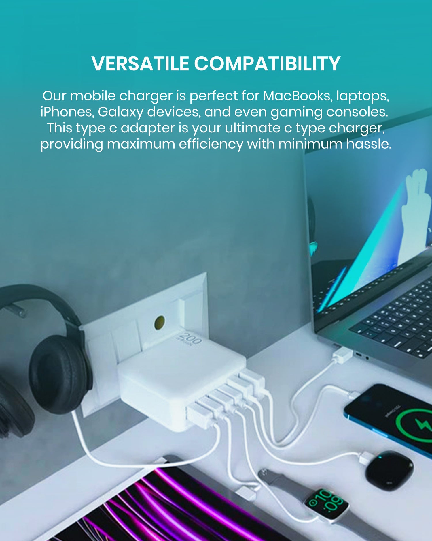 Versatile Compatibility: Our mobile charger is perfect for MacBooks, laptops, iPhones, Galaxy devices, and even gaming consoles. This type c adapter is your ultimate c type charger, providing maximum efficiency with minimum hassle.