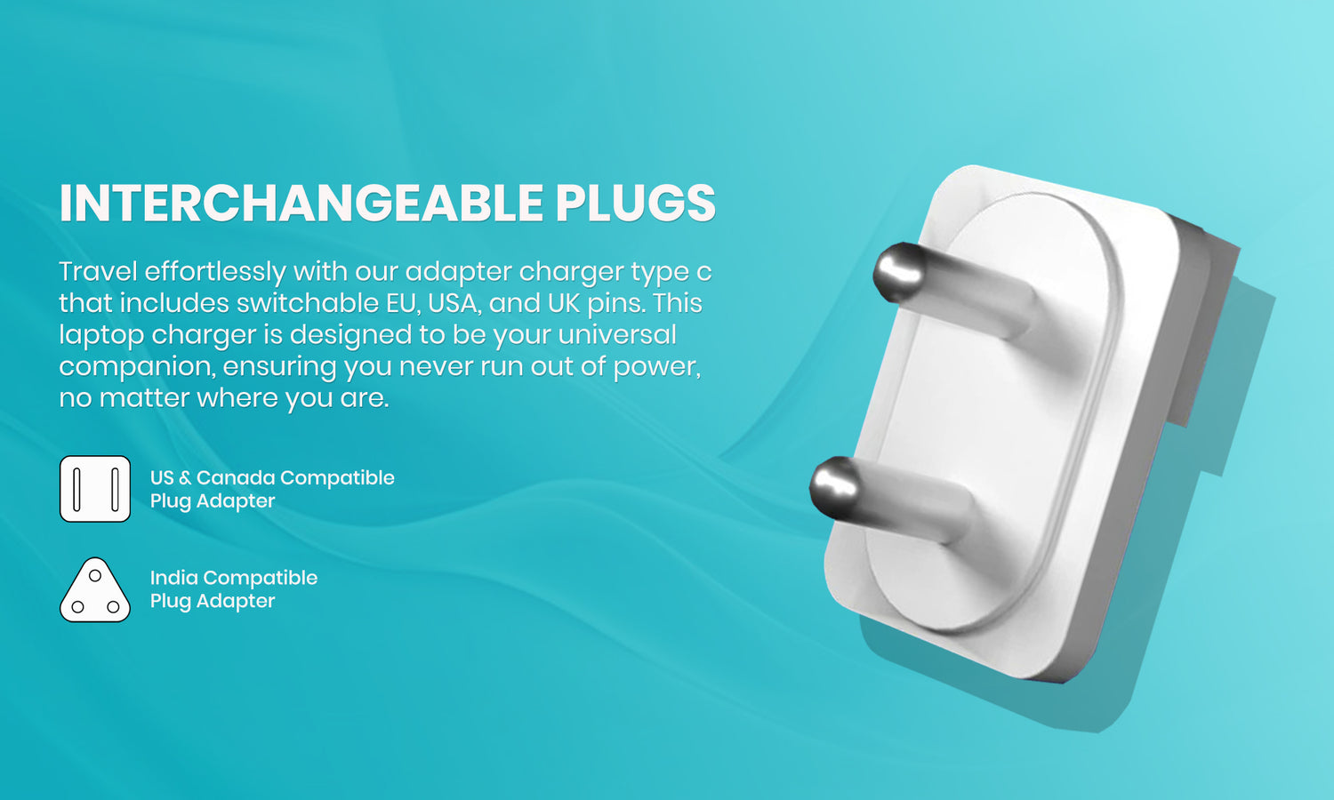 Interchangeable Plugs: Travel effortlessly with our adapter charger type c that includes switchable EU, USA, and UK pins. This laptop charger is designed to be your universal companion, ensuring you never run out of power, no matter where you are.