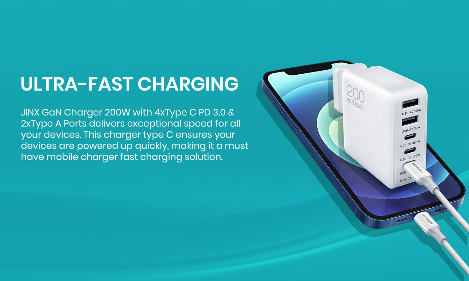 Ultra-Fast Charging: JINX GaN Charger 200W with 4xType C PD 3.0 & 2xType A Ports delivers exceptional speed for all your devices. This charger type c ensures your devices are powered up quickly, making it a must-have mobile charger fast charging solution.